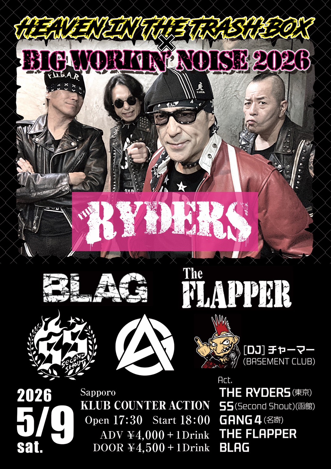 【LIVE】 THE RYDERS(東京) SS(Second Shout)(函館) GANG4(名寄) THE FLAPPER BLAG 【DJ】 チャーマー (BASEMENT CLUB) 【チケット】