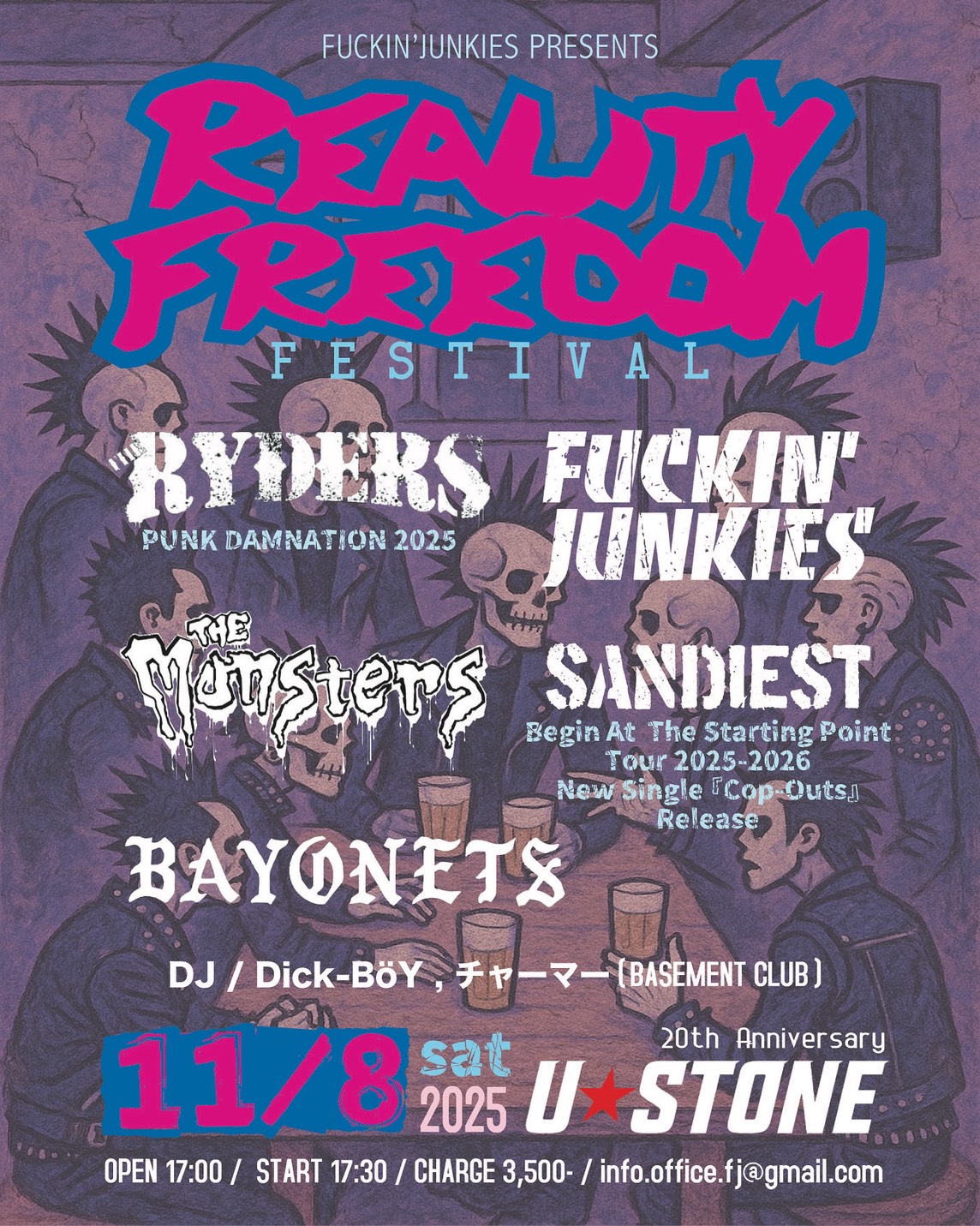 出演 THE RYDERS FUCKIN’ JUNKIES THE MONSTERS SANDIEST BAYONETS DJ Dick-BöY DJ チャーマー (BASEMENT CLUB)