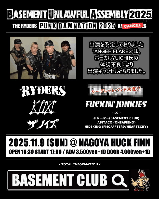 出演 THE RYDERS KiM FUCKIN' JUNKIES THE NOiSE and シークレットバンド DJ : チャーマー (BASEMENT CLUB) APiTACO (ONEAPiENO) HIDEKING (FMC/AFTER9/HEARTSCRY)